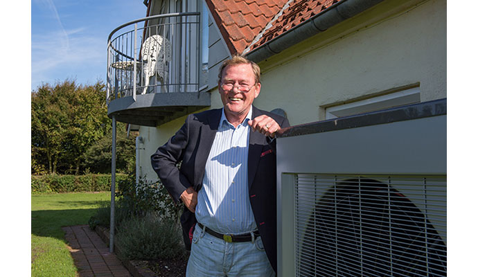 320 kvm kræver en stor varmepumpe. Per G. Asmussen viser frem. Den fylder lidt i haven, men skæmmer ikke.