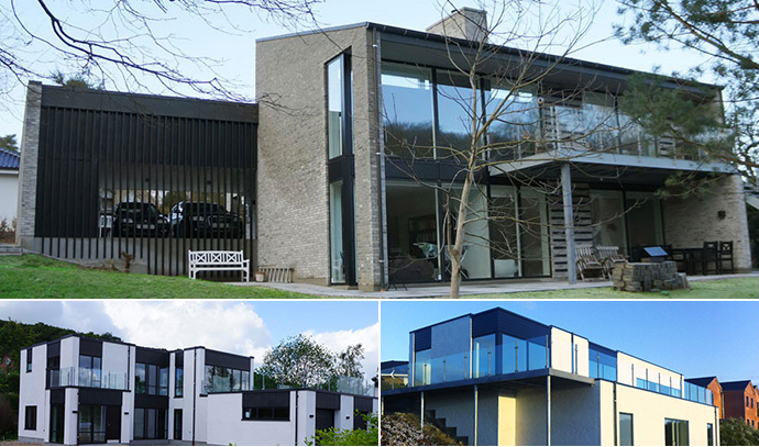 Alle de viste huse er designet med baggrund i kundens ønsker og drømme. Kontakt AB Huset hvis i ønsker et gratis skitseoplæg på jeres drømmehus, hjælp til arkitektarbejde eller et tilbud på opførelse af jeres bolig efter allerede udførte tegninger.