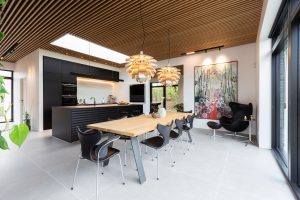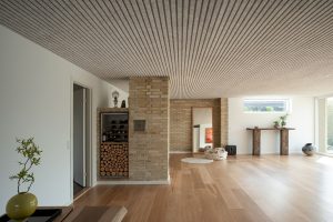 Listeloftet Troldtekt contrast udgør det eksklusive loft i denne 300 kvadratmeter store drømmebolig i Kolding. Loftet har en mørk baggrund af sorte Troldtekt akustikplader, som er beklædt med trælister i egetræ. Troldtekt contrast var finalist ved Danish Design Award 2019.