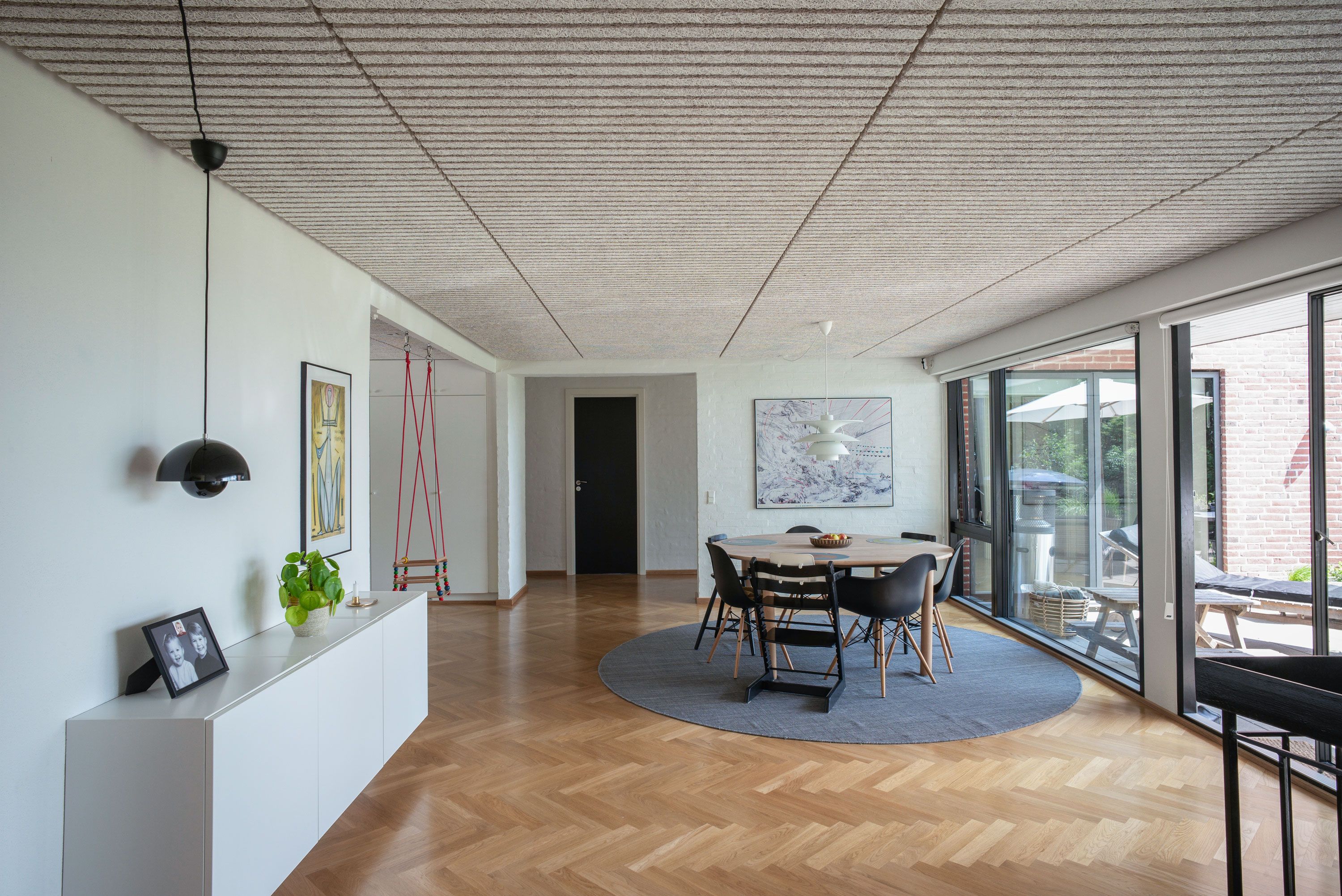 Da en familie fra Aarhus rykkede ind i en arkitektperle ved Herning, var en lettere renovering nødvendig for at bringe alle husets kvaliteter i spil. I alle rum i den fladtagede del af huset, er der anvendt designløsningen Troldtekt line, som markerer sammenhængen mellem husets tre dele.