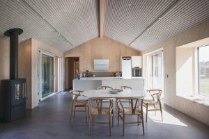 Med serien af Troldtekt designløsninger er der utallige muligheder for at kombinere, så dine projekter får det individuelle udtryk, du ønsker. I dette sommerhus er der i opholdsrummet monteret Troldtekt line, som giver en visuelt rolig loftsflade med langsgående spor.