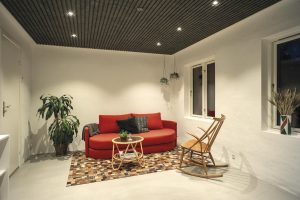 Gennem halvandet år har Nadja Fischer og Thomas Krogh totalrenoveret deres hjem i Viby ved Aarhus. Til kælderens loft er der valgt en mørkegrå variant af designloftet Troldtekt line med langsgående spor i overfladen. Loftet er et træprodukt, der harmonerer med parrets fokus på miljø og organiske materialer.