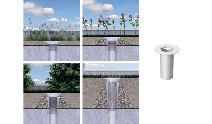 BLÜCHER har et komplet udvalg af produkter til grønne tage. BLÜCHERs udendørs afløb i rustfrit stål har et perforeret rør mellem rammen og underdelen, som gør det muligt at afvande alle lag i det grønne tag. Et sandfang vil desuden forhindre jord i at komme ind i afløbssystemet, og der kan vælges en passende rist til afløbet.