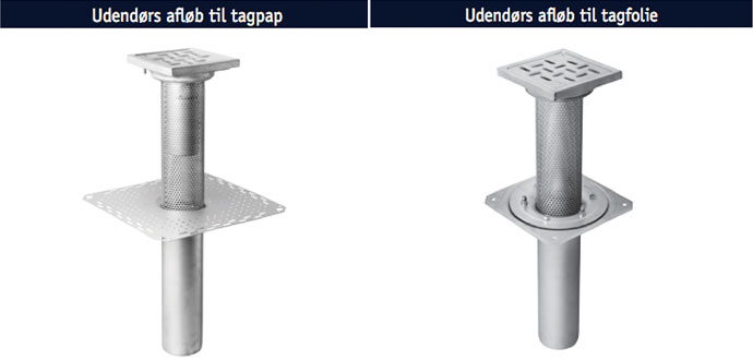 Det udendørs afløb består af en justerbar overdel 200×200 med et perforeret rør Ø110 eller Ø160 mm, der kan afkortes. Overdelen passer ned i underdelene til tagfolie og bitumen som i det øvrige tagafvandingsprogram.