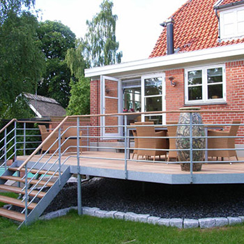 Ny flot speciallavet galvaniseret stål altan eller terrasse, med gelænder i mahogni eller med rustfri håndliste.