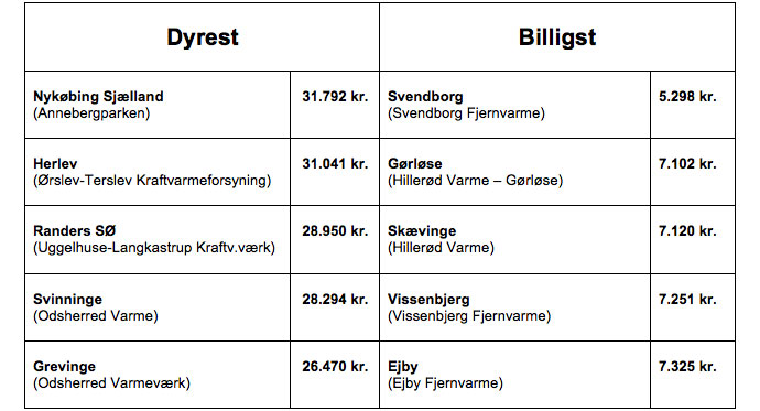 Nedenfor fremgår de 5 dyreste henholdsvis billigste fjernvarmeværker.