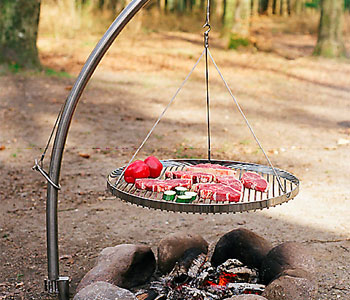 Som udendørs kok er det rart med det rigtige udstyr, så du kan koncentrere dig 100% om råvarerne og tilberedningen. Og det er meget nemt at installere dette udstyr. Du banker eller støber jordspydet ned i kanten af bålpladsen, hvorefter du nemt placerer armen i beslaget. Til sidst hænger du den store runde grillrist op i wiren på armen, og køkkenet er klar til brug.