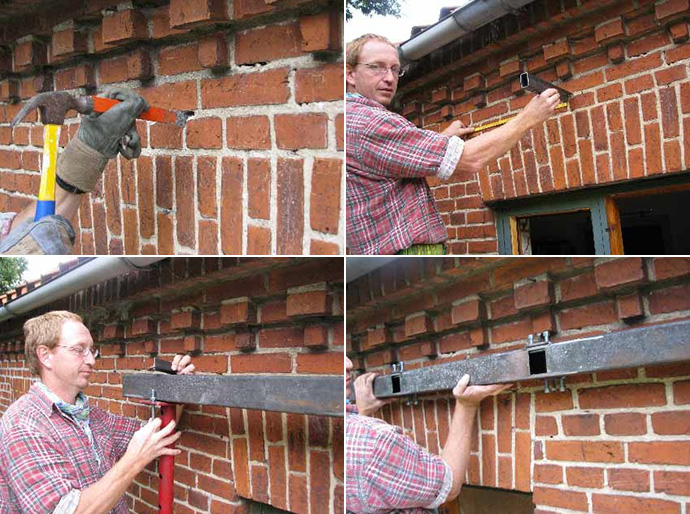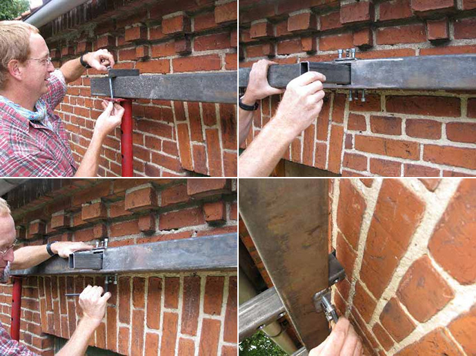 Bærebjælken fastspændes stramt på blådrengene og bærearmene indsættes gennem hullerne ind i de i murværket udhuggede L-vinkler.