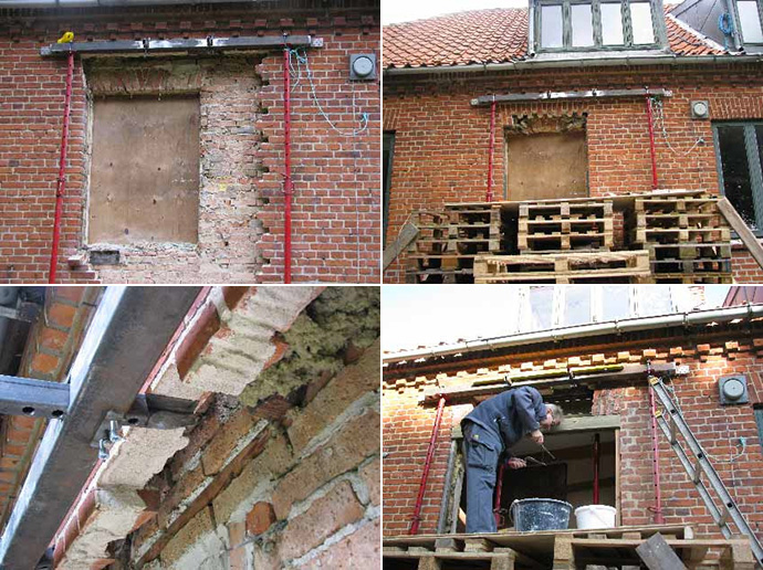 Herefter er muren fastholdt og etablering af åbning kan foretages. I det viste tilfælde skal bredden af en åbning gøres større. På billedet til højre er det eksisterende stik fjernes og hullet gjort bredere.