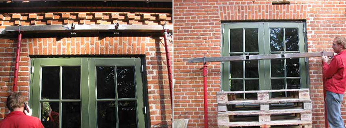 Til at illustrere bæringen er stenene under bærearmen fjernet, således at funktionaliteten tydeliggøres. Da stabiliteten nu er sikret, kan det ny stik opmures og den ønskede dør isættes.