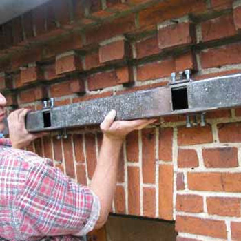 I fugen under det murværk, der ønskes midlertidig fastholdt, udhugges en L-vinkel, hvor studs- og liggefuge mødes. Dette gøres 2 steder med en vandret afstand på cirka 600 mm. Dimensionerne for den udhuggede L-vinkel er cirka 40 mm i liggefuge og 50 mm i studsfuge. Fugen udhugges i cirka 70 – 90 mm dybde, således at bærearmen kan “gå i bund”. Dvs til det punkt, hvor bærearmen går fra vinkelprofil til firkantprofil. Udhugningen foretages op mod den sten der bliver bærende således, at der ikke er løs fuge mellem sten og bærearm.