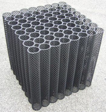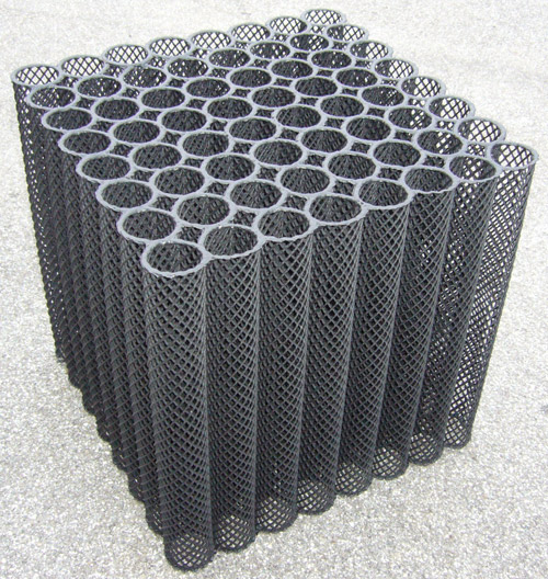BIO-BLOK® elementets karakteristiske opbygning af netrør giver faskinen et langt større rumindhold regnvand pr. kubikmeter i forhold til en traditionelt udformet stenfaskine.