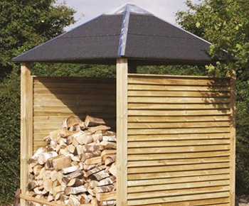 Brænderum / brændely i træ med jalousibeklædning der er opbygget på en sådan måde, at træet sikres den rigtige ventilation, så tørringen bliver optimal. Opbygningen betyder også, at der er regntæt, så træet ikke ligger og rådner.