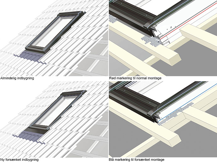 De nye VELUX ovenlysvinduer er forberedt til montering med 40 mm forsænket indbygning. For at gøre installationen endnu nemmere for håndværkeren er både inddæknings-emballagen og vinduets karm markeret med farver. På emballagen er normal installations-højde markeret med en rød firkant og forsænket indbygning med en blå. De samme farver går igen på karmen, hvor røde og blå linjer indikerer, hvor beslagene skal monteres for at opnå en korrekt installationshøjde. Når montagebeslagene fastgøres på siderne af karmen ved den BLÅ markeringslinje, passer afstanden til den nye forsænkede inddækning.