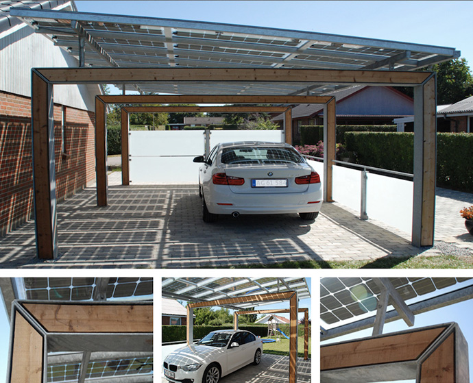 I denne fritstående carport er designet i en klasse for sig. Portalernes indlæg af varmebehandlet træ kan males, så der dannes en naturlig forbindelse til en overflade på hovedhuset. Taget er af glas eller af halvtransparent solcelleglas.