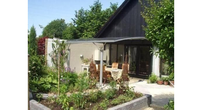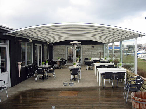 Det øveste billede viser en terrasseoverdækning på en Restaurant Oven Vande, Strandvejen 121 i Fredericia, hvor den kan ses ved selvsyn. Henrik Lyager som ejer restauranten er MEGET tilfreds med resultatet, og han ser nu udendørssæsonen forlænget væsentligt.
