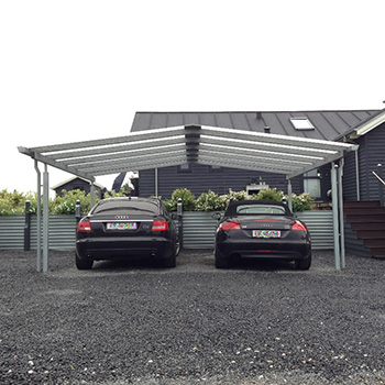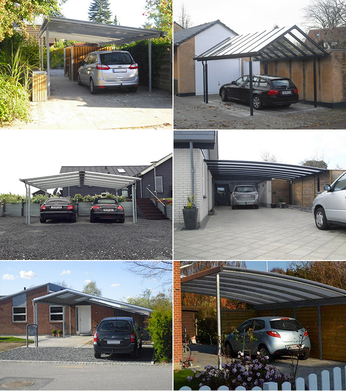 Dansk Stål Design laver carporte med skråtag, saddeltag eller sidehængte. Carporten bliver lavet efter dine specialmål, så den passer til den plads du har til rådighed.