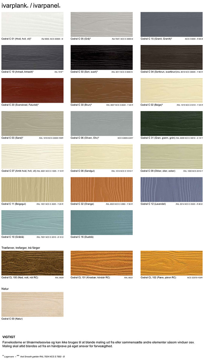 Farverne er kun vejledende, så når du har fundet den farve du kan lide, kontakt ivarplank og få en vareprøve tilsendt.