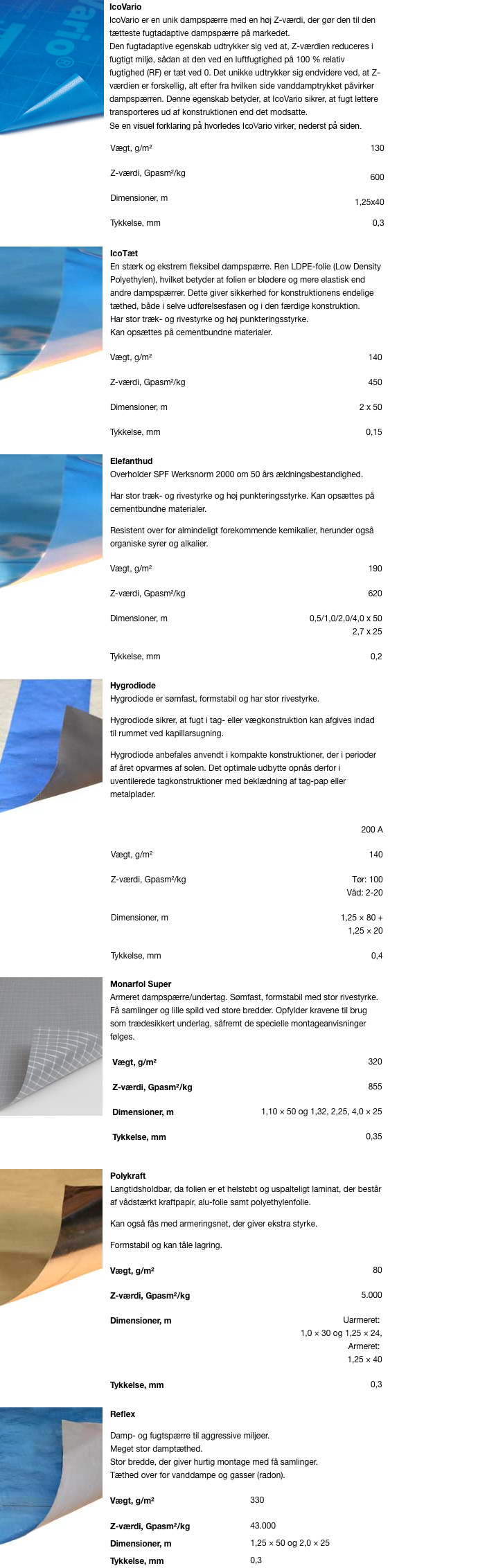 Icopal tilbyder et bredt sortiment af dampspærrer til både gulv-, loft- og vægkonstruktioner. Sortimentet omfatter alt lige fra almindelige PE-folier over specialprodukter med ekstrem høj Z-værdi til “dynamiske” dampspærrer som IcoVario, der tillader udtørring af fugt i en lang række konstruktioner. I oversigtsnøglen, får du et overblik over de forskellige muligheder.