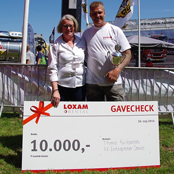 Thomas Kristensen vandt DM i minigraver. Her lykønskes han af adm. direktør for LOXAM Danmark Hanne Baunsgaard.