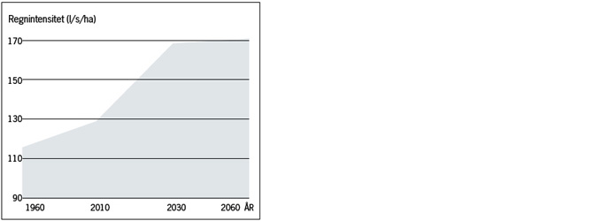 I de næste 50 år viser COWI’s beregninger en stigning på 35 % i forhold til i dag. Det er en forandring af klimaet, der er i fuld gang, hvor sommeren vil byde på flere tørre perioder med færre men betydelige kraftigere regnskyl, også kaldet skybrud.