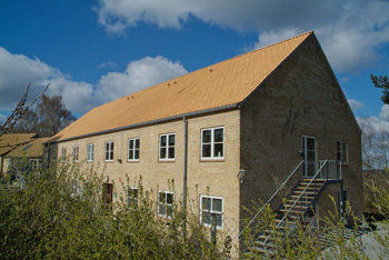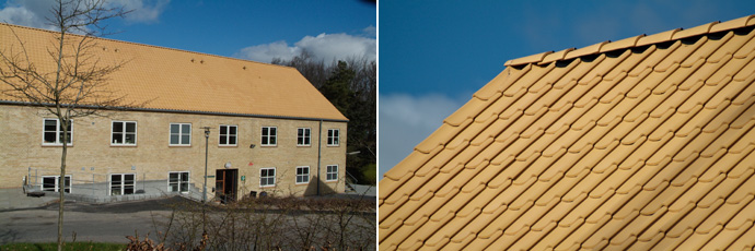 Bygningen, der var godt nedslidt, fik den helt store omgang, fortæller Henning Elkjær Rasmussen, Murer- og Entreprenørfirmaet Elkjær A/S i Mejlby ved Nørager. Fra institutionens side ønskede man bedre og mere tidssvarende boliger med nye badeværelser og køkkener. Taget var også tjenligt til udskiftning. Valget stod mellem to forskellige gule vingetagsten, men i sidste ende faldt valget på den gule Dantegl fra Monier, hvilket bl.a. skyldes den flotte varme rødgule farve. Et smukt syn, når man ser den let bølgede gule tagflade mod den blå forårshimmel. I forhold til den oprindelige vingetagsten, som er meget dyb i bølgen, er der langt større harmoni over den nyoplagte tagflade. Tagstenen er også nem at arbejde med, så jeg har kun godt at sige om den nye gule Dantegl vingetagsten.