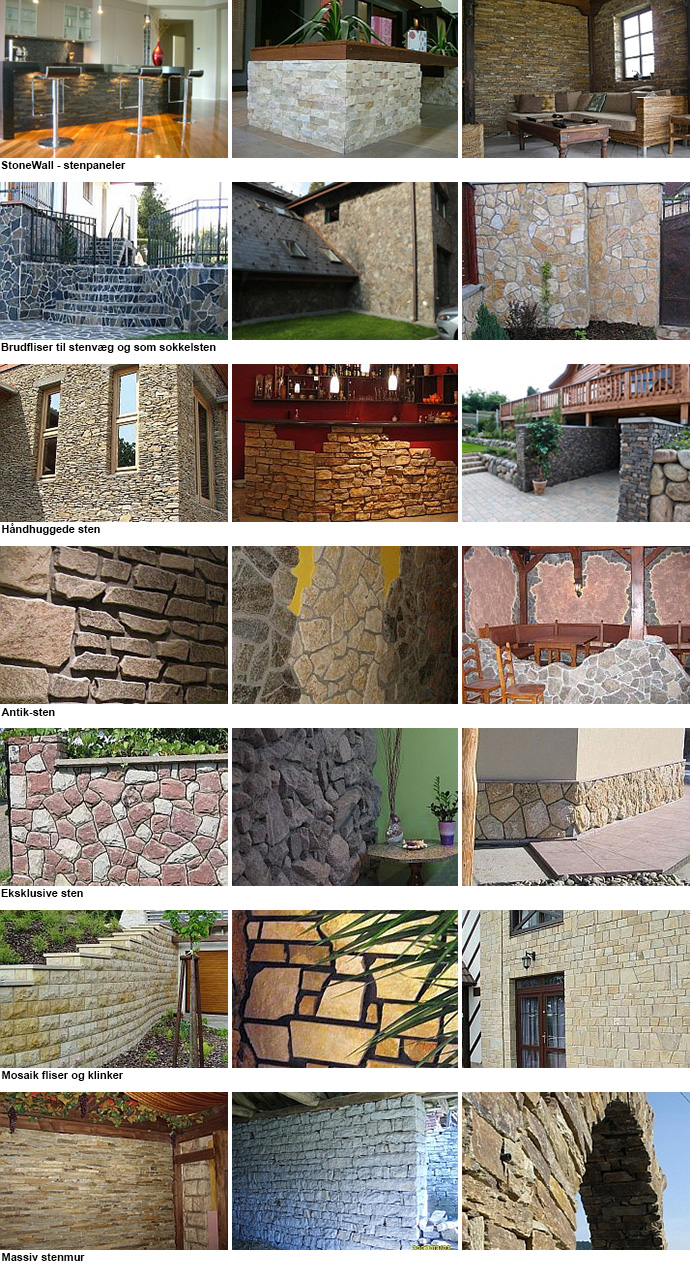 Stenene kan fås løse, hvilket giver en stor frihed i forhold til struktur og overflade ved opbygningen af en stenvæg. Ellers kan du kan bestille stenpaneler, der er nemme og hurtige at montere.