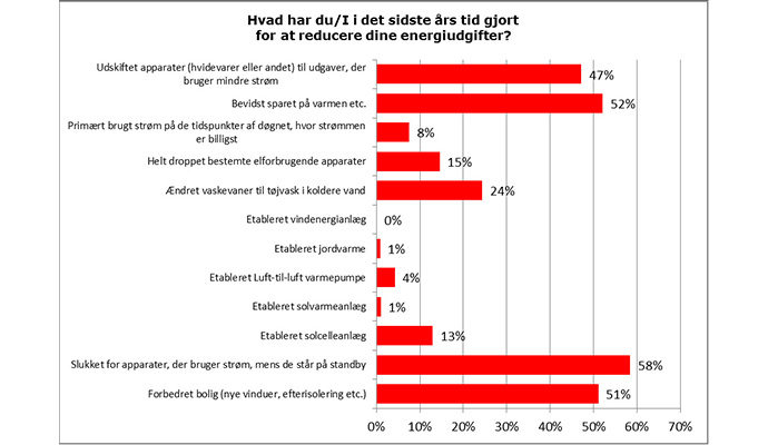 Rigtigt mange svarer, at de bevidst har gjort noget for at bruge mindre energi i det forløbne år. De fleste sparer på boligens energiudgifter ved at slukke for de apparater, der bruger strøm på standby, og ved bevidst at spare på varmen. Det er dog kun tre ud af fem, der ved om deres ændrede energiadfærd har haft den ønskede effekt.