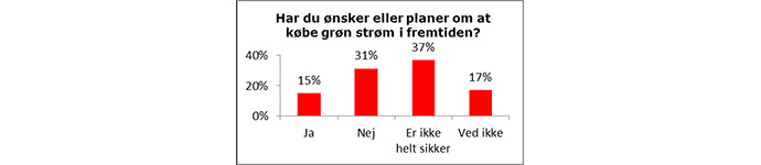 Selvom over halvdelen af respondenterne mener, at 2020-målsætningen skal opnås gennem adgangen til billigere og grønnere strøm, så viser rundspørgen, at kun 15 procent har planer om at købe grøn strøm i fremtiden. Men samtidigt er der en stor gruppe, der er uafklarede, og som måske vil kunne flyttes med de rigtige argumenter, og således øge sandsynligheden for et grønnere og mere energirigtigt Danmark.