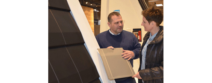Allerede inden Byggeri ’14 åbner har interessen for det nye tag været overvældende. Her ses salgsdirektør Flemming Adolfsen ved det nye tag, Quadro by Icopal, i samtale med en kunde.