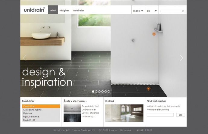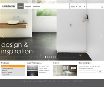 Mere end 75% af danske installatører og arkitekter søger jævnligt information på leverandørers webside. unidrain® præsenterede derfor en ny hjemmeside i sommeren 2011, og har siden bl.a. investeret i en onlinekonfigurator til linjeafløb over 1200 mm, der sparer rådgiveren tid og ressourcer i planlægnings- og projekteringsfasen. Og Unidrain A/S fortsætter den progressive udvikling.