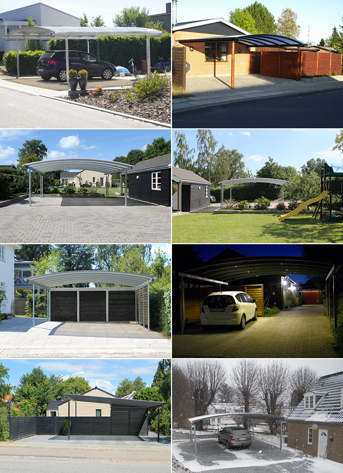 F.eks. carport dobbelt – carport enkelt – carport med saddeltag – carport med buet tag – carport med redskabsrum – carport med cykeloverdækning – carport med skrå tag – carport i galvaniseret eller carporte der er pulverlakeret – carporte sammenbyggede – carport med cykelskur – carport med rygerum – carport med terrasseoverdækning – carport overdækning – carporte til andelboliger – carport til erhverv – carport til ejerboliger.