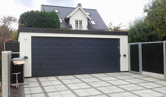 Her et eksempel på hvor enkel og elegant en dobbeltgarage kan se ud, med en port i fuld bredde.