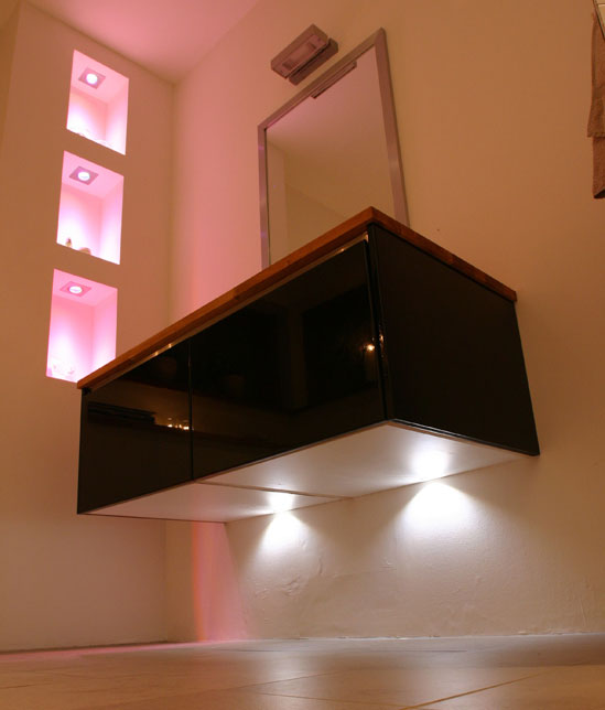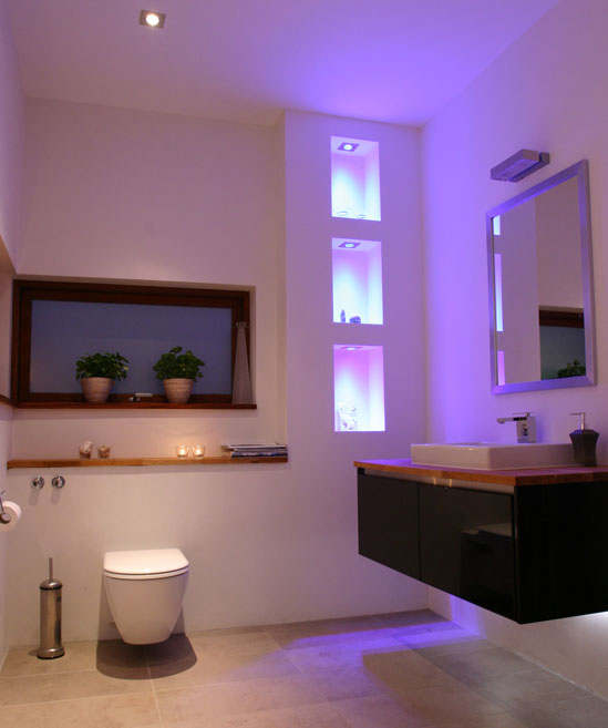 ”Vi arbejder meget med LED, som er fremtidens belysning. Le¬vetiden er meget lang – op mod 40 år, og strømforbruget er me¬get lavt; 1 watt pr armatur. LED-belysning er yderst velegnet til indendørs hygge- og effektbelysning og bruges bl.a. til sok¬kelbelysning, lys i vitrineskabe, ophængte skabsarrangementer etc. Det er muligt at kreere over to millioner farver med LED-belysning, så der er rig mulighed for, at variere belysningen efter humøret. Det er muligt at lave automatisk skift mellem farverne i fast interval, eller man kan fastfryse en enkelt ønsket farve. Kunden kan regulere det hele på en enkelt kontakt”, fortæller Lars Martens.