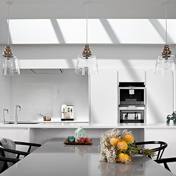 Valget af VELUX ovenlysmoduler i familiens nye privatbolig viste sig at være det helt rigtige. Køkkenalrummet, hvor ovenlysmodulerne er placeret over samtalekøkkenet, er blevet familiens yndlingsrum. Ejeren af huset fremhæver, at dagslyset fra himlen kan fornemmes i hele huset, hvilket gør løsningen til den helt rigtige investering. Familien kan stå at lave mad i solens skær og samtidigt åbne op for ovenlysmodulet, så den varme luft fra madlavningen trækker ud hurtigt, og rummet bliver behageligt at være i.