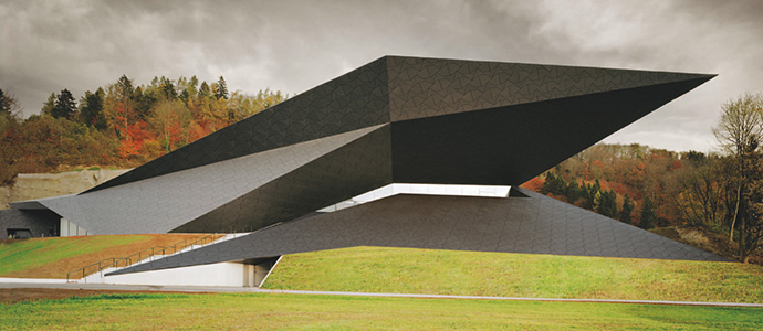 Læs om, hvordan arkitekterne bag byggeriet, Delugan Meissl Associated Architechts, har tilstræbt af matche byggeriets udformning med det omkringliggende landskab, så musikhusets kurver, vinkler, diagonaler og rundinger følger naturens topografi.