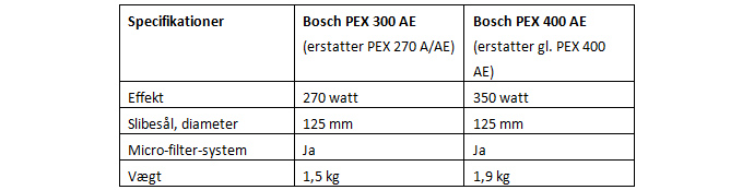 Bosch udvider nu deres serie af kompakte værktøjer med to nye excenterslibere PEX 300 AE og PEX 400 AE, der er henholdsvis 12 og 25 procent mindre end deres forgængere. Excenterslibernes kompakte størrelse gør arbejdet med slibning, pudsning og polering endnu lettere, samtidig med at vibrationsniveauet er væsentligt reduceret.