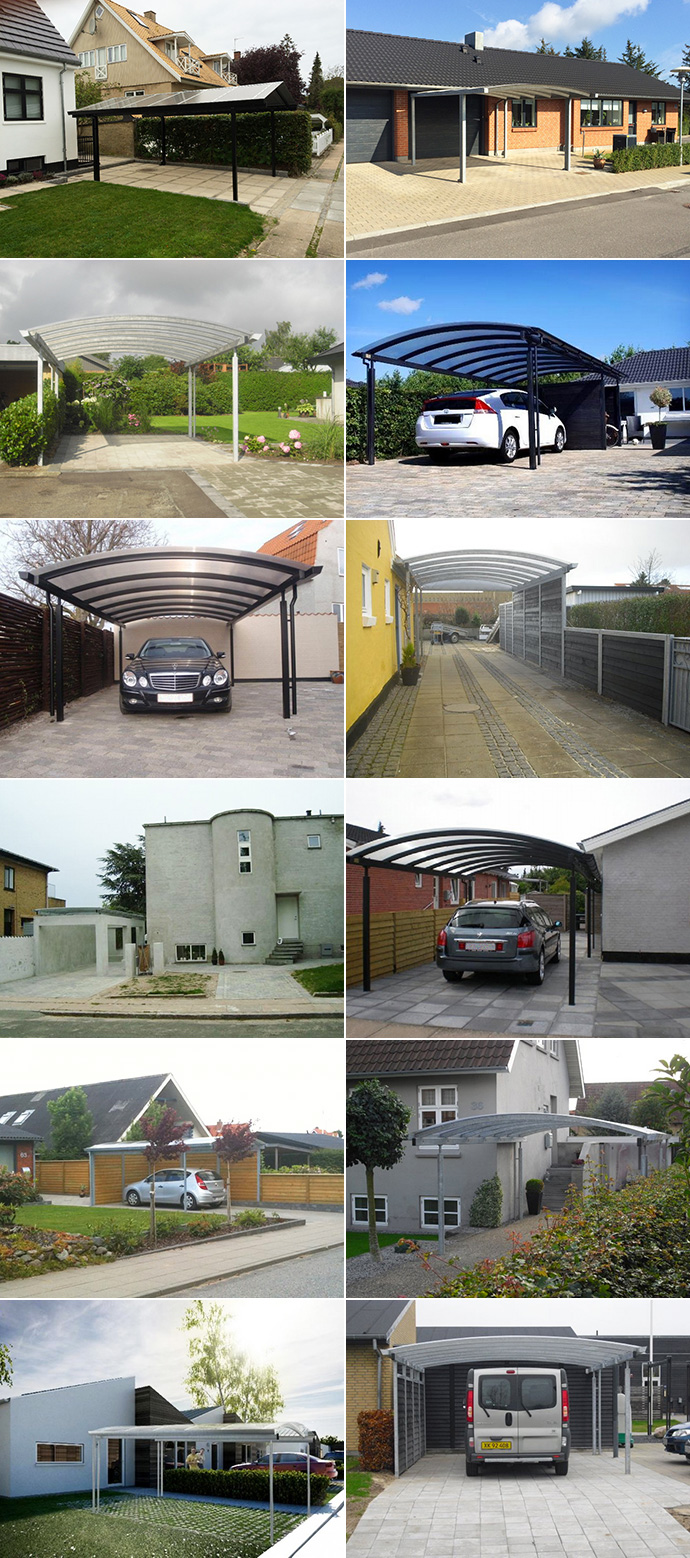 F.eks. enkelt carport – carport med saddeltag – carport med buet tag – carport med redskabsrum – carport med cykeloverdækning – carport med skrå tag – carport i galvaniseret eller carporte der er pulverlakeret – carporte sammenbyggede – carport med cykelskur – carport med rygerum – carport med terrasseoverdækning – carport overdækning – carporte til andelboliger – carport til erhverv – carport til ejerboliger.