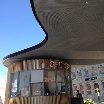 Pavillonen med den amøbeformede overdækning, har hurtigt fået tilnavnet ”Spunken”, og giver ly til en lille cirkulær kiosk og ventende buspassagerer. Arkitekternes intention er, at den skal være med til at transformere ventetiden fra en passiv venten til en aktiv deltagen. Torvet udstyres derfor med løse stole, som de ventende kan flytte rundt som de vil, hvorved der skabes en dynamik, der kun vil styrke torvets og byens liv. Som bygningsmæssig eksponent for det 20. og 21. århundredes offentlige transport rejser pavillonen sig i pladsens østlige ende.