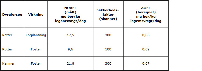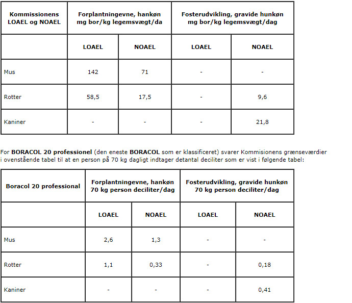 Dernæst etablerede man den højeste daglige mængde som over en langvarig periode ikke havde nogen skadelige virkninger. Den kaldes NOAEL (No Observed Adverse Effect Level). For rotter var den 17,5 mg bor/kg legemsvægt/dag for forplantningsevnen for hankøn; for fosterudvilingen i gravide rotter var NOAEL 9,6 mg bor/kg legemsvægt/dag og 21,8 for kaniner. Her er en oversigtstabel over Kommissionens værdier for LOAEL og NOAEL: