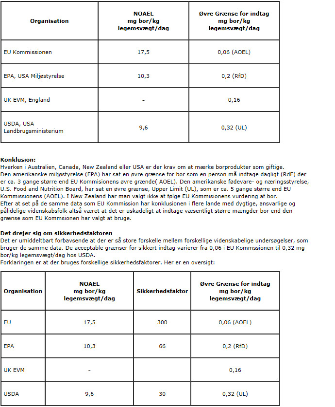 EPA’s øvre grænse for uskadeligt indtag af bor, Reference Dose (RfD) er 0,2 mg/kg legemsvægt/dag, hvilket er ca. 3 gange mere end EUKommissionens AOEL (0,06).