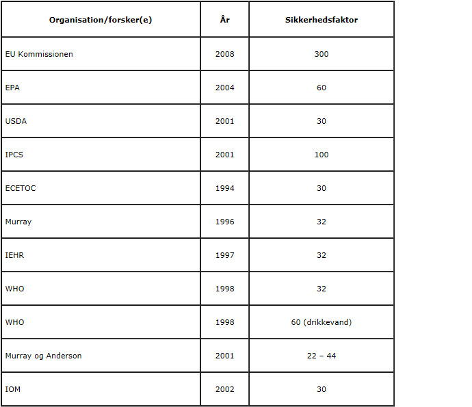 Institute for Evaluating Health Risks (IEHR) bruger en sikkerhedsfaktor på 30, beregnet i 1997.
