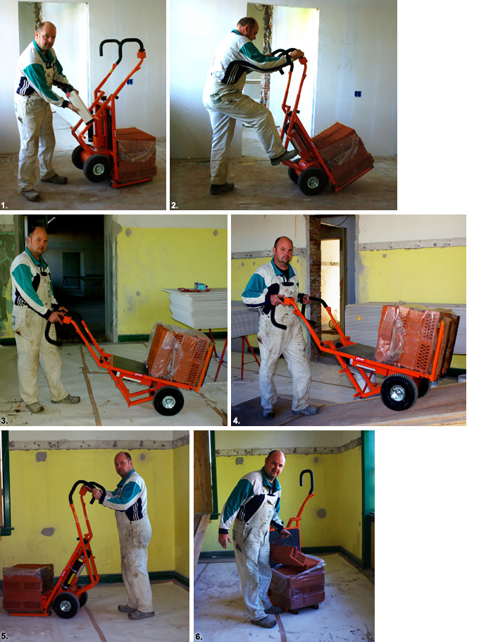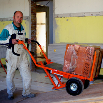 ”Det går som en leg – op og ned ad ramper, rundt i bygningen og på stilladser. Inden vi fik stenvognen, skulle vi være op til tre mand for at skubbe en vogn op ad den her rampe, men nu klarer el-motoren arbejdet for mig.”
