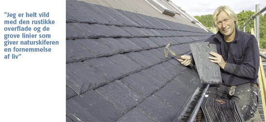 ”Valget kunne være faldet på stråtækning eller lertegl, men naturskifer er et helt fantastisk materiale, ” siger Peitersen. ”Naturskiferen har en unik historie, og strukturen i stenen gør, at lyset brydes på en helt speciel måde i overfladen, hvilket er med til at give taget sit utrolig flotte udseende. ”