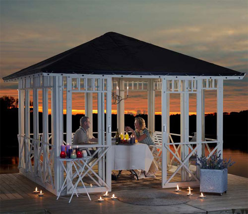 En “PLUS-hyggekrog” som en pavillon, indbyder til at tilbringe sommerens stjernestunder i haven. Alene med en god bog,i stille tosomhed. I stemningsfuldt selskab med gode venner. Eller i familiens skød.