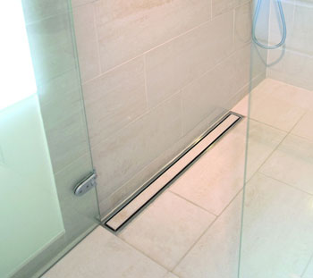 I indretningen af badeværelset har det også vægtet meget, at der skulle anvendes gedigne materialer, og at indretningen skulle være praktisk, også med hensyn til rengøringen. Gulvafløbet er helt i rustfrit stål, som er let at rengøre og holde rent og samtidig et materiale, der består uforanderligt mange år frem i tiden.
