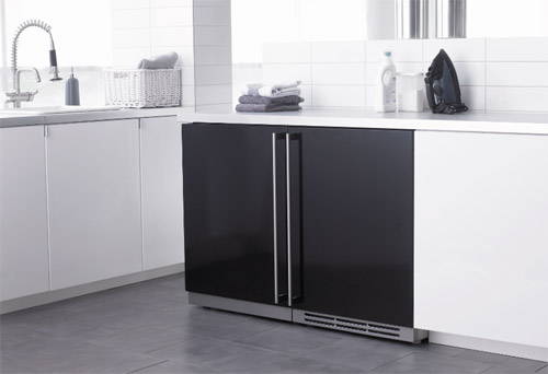 låge i samme design som den øvrige skabsindretning eller dækkes af en elegant låge i stål, som kan tilkøbes i rustfrit eller lakeret i sort eller hvid, og på den måde smelte sammen med helheden.