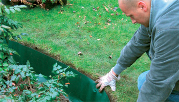 Først graves der ud, så fiberdugen RootSeal™ kan nedsættes lodret i jorden langs kanten i bedet. Den kraftige grønne fiberdug virker som en afskærmning og hjælper rødderne med at vokse nedad i stedet for at brede sig langs jordoverfladen. RootSeal™ fungerer desuden som en plænekant, så granitskærverne bliver inde i bedet i stedet for at ende ude i græsplænen til stor irritation for den person, der skal slå græsplænen.