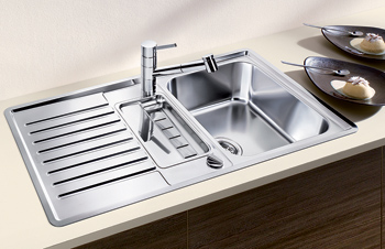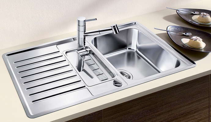 BLANCO CLASSIC PRO 6 S-IF med MikroKant® leveres med en praktisk skylleskål i rustfrit stål – som ekstra tilbehør kan man bl.a. købe et skærebræt i bøg, der let kan glide langs vasken. Excenterknappen styrer afløbet i den store vask – med et let drej lukkes eller åbnes for kurveventilen. Armaturet er et BLANCO TIVO-S, der ikke pt. forhandles i Danmark.