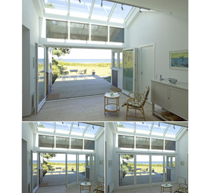 Et virkelig spændende alternativ til den traditionelle hæve/skydedør er denne robuste og meget betjeningsvenlige indadgående foldedør. Den er ligeledes ideel som ruminddeler f.eks. imellem stue og havestue. Udføres med 3 til 8 dørrammer op til en samlet bredde på 6,00 m. Antal, fløj- inddeling og gennemgangsdørens placering i elementet, produceres efter individuelle ønsker.